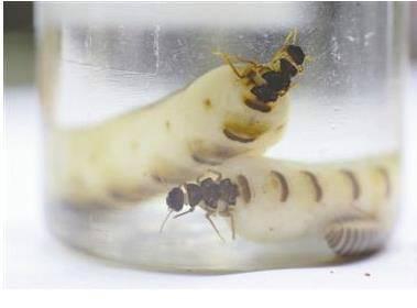 俗話說;千里之堤,潰于蟻穴;而白蟻作為一種迫害性極大的世界性害蟲,它可能在無聲無息中,蛀蝕樹木、屋宇、家具,十分討厭。白蟻防治方法許多種白蟻巢內均有真菌、細菌和病毒寄生,其中許多微生物能引起白蟻疾病,最后導致白蟻死亡,直至全巢覆沒。另外,巢內寄生的螨類有時也能殺滅白蟻。最近,防治白蟻的工作人員就在鎮(zhèn)江市區(qū)勝利端掉了一處白蟻巢穴,捕獲到一只長約5公分25歲大的蟻后。在鎮(zhèn)江市綠化治理站記者見到了這只保存在酒瓶里的黑翅土白蟻蟻后 ;它長約5公分,整體呈淡黃色,顯得十分肥碩。工作人員介紹,本月16號,他們發(fā)明引資大道上的行道樹被白蟻啃食的景象十分重大,依據痕跡,他們在鄰近的綠地挖了3天,終于找到了蟻巢,取出了這只蟻后。