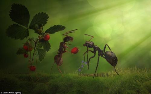 不同的螞蟻吃不同的食品。收獲蟻吃種子,它們將種子收藏在地窖里;而割葉蟻吃蘑菇,它們將葉片搬運(yùn)到地下,用來(lái)培植蘑菇。有些螞蟻則貯存一種叫蚜蟲(chóng)的昆蟲(chóng),它們從蚜蟲(chóng)體內(nèi)抽取一種含糖的物質(zhì)作為食品,這同人類從母牛身上擠奶的方法十分類似。